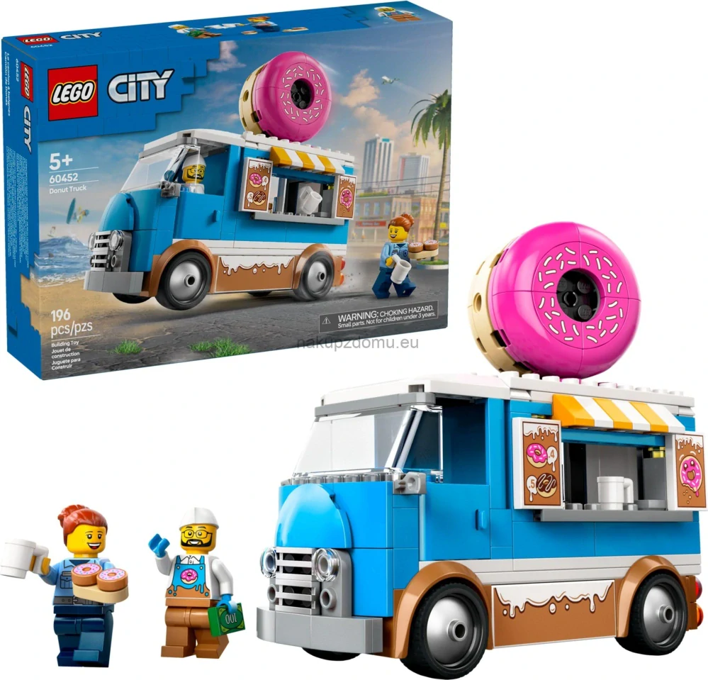 Stavebnice LEGO® City 60452 Truck s donuty přináší mobilní stánek s odnímatelným kioskem, 196 dílků a 2 minifigurky (prodavač a zákazník). Děti si připraví donuty v kuchyňce, obsluhují z okénka a hrají bez baterií nebo samolepek.
